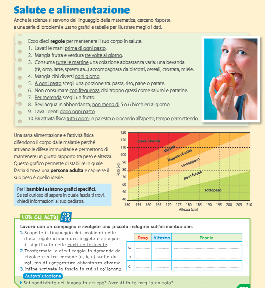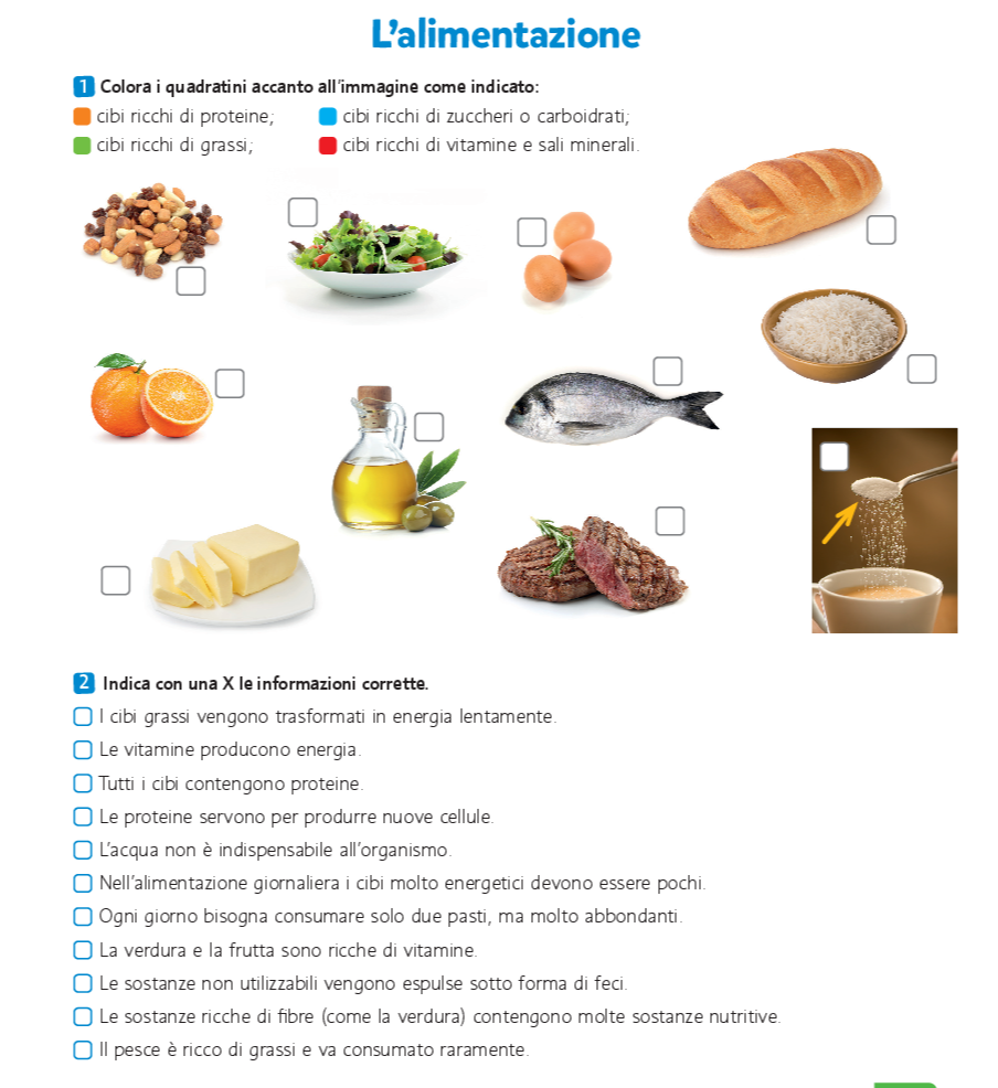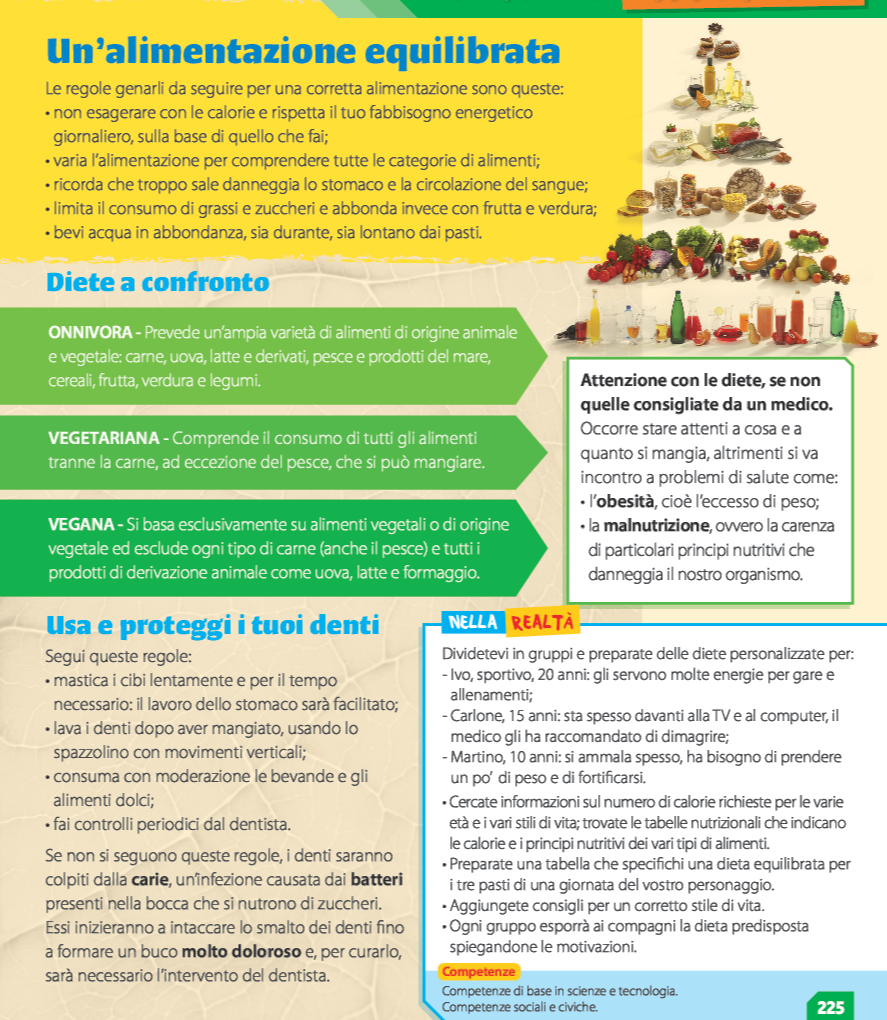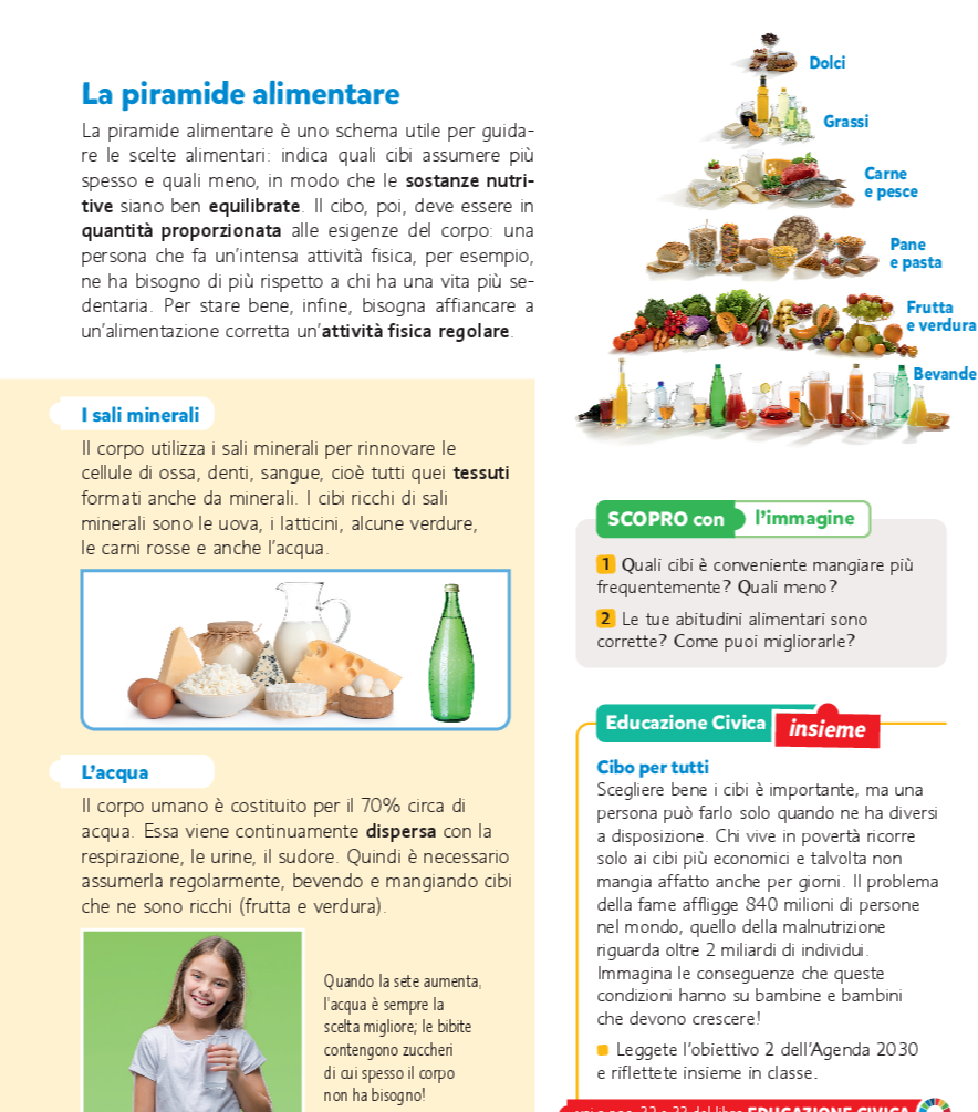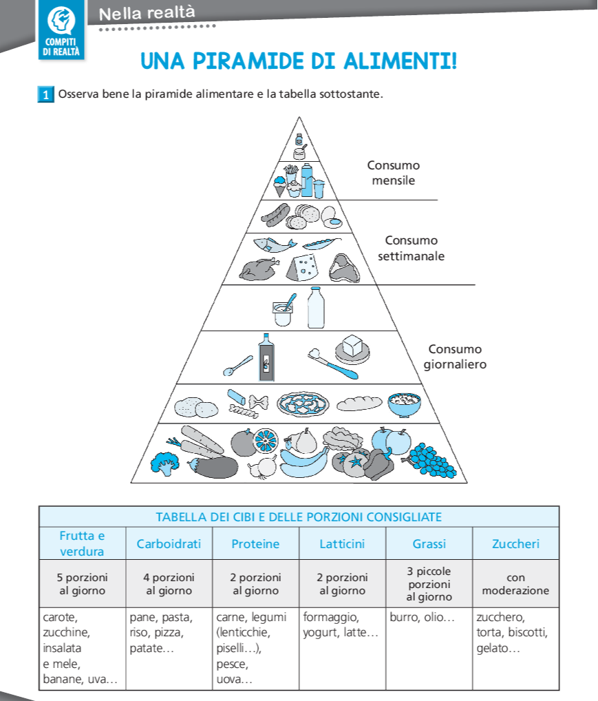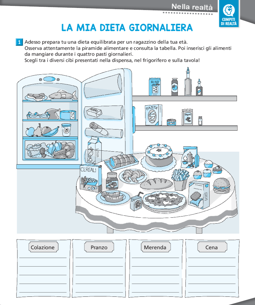 Dopo aver spiegato i principi di una dieta equilibrata e la piramide alimentare, invitiamo gli alunni a creare il proprio menu giornaliero, scegliendo i pasti e gli spuntini facendo attenzione agli alimenti consigliati in ogni categoria.
